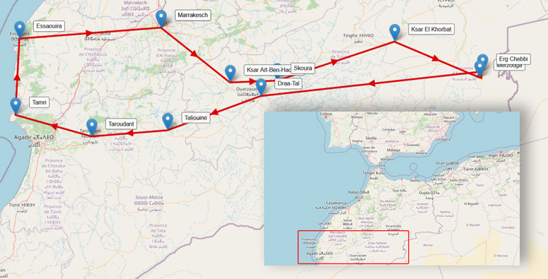 Weiterfahrt vorbei an Agadir und Zwischenstopp in Tamri, einem Ort, an dem sich Wüste und Atlantik begegnen. Bei Tee und einem einfachen Mittagessen mit Einheimischen lässt sich der Übergang von Küste zu Dünenlandschaft erleben. Anschließend geht es entlang der Küste nach Essaouira. Check-in im Hotel, gemeinsames Abendessen und Übernachtung.