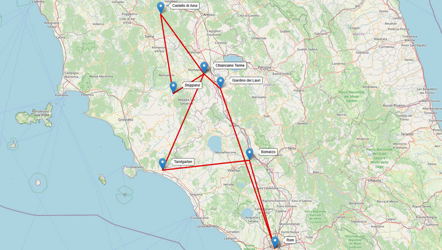 Die Reise führt zum zwei Hektar großen Giardino dei Tarocchi (Tarotgarten), wo Niki de Saint Phalle 22 knallbunte und teilweise riesige Phantasiewesen hingestellt hat, die den Figuren der Tarotkarten gewidmet sind: die Päpstin, das Glücksrad, den Turm etc. Die Großfiguren sind begehbar, haben Treppen auf dem Rücken oder Türen im Mund. Dazwischen stehen sich drehende, Wasser speiende Phantasiemaschinen von Jean Tinguely. Der Garten ist eingerahmt in die traumhafte Landschaft der Maremma – und es ergeben sich immer wieder Blicke auf die Küste.